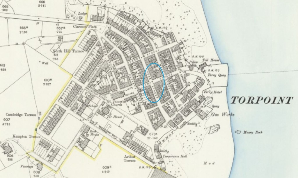 Jacob married Dolly (sometimes called Dora) Pearce on 24 June 1832 in St Andrews’ church in Plymouth. They had four sons, one of whom died in infancy. Jacob seems to have done well as a tailor and by the 1861 census the family were living in Fore Street, Torpoint (see the map OS Devon CXXIII.6 published 1894). Jacob was described as master tailor employing one man and one boy; both were living with the family.