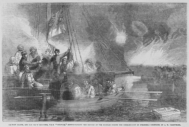 Carmichael, James Wilson. Captain Glasse, and his Chief Engineer, H.M.S. “Vulture,” superintending the Repairs of the Mortars during the Bombardment of Sveaborg. Illustration for The Illustrated London News, 5 April 1856. James Wilson Carmichael, Public domain, via Wikimedia Commons.