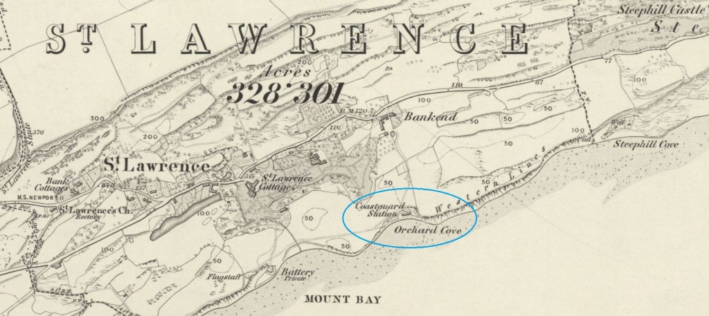 Joseph’s last ship, before he joined the coastguard service, was HMS Impregnable, from 6 April 1860 to 22 May 1860. His first posting as a coastguard was as a boatman and in 1861, he is living with his wife and daughter in Victoria Terrace, Ventnor and described as a coastguard and retired cooper. The coastguard station was to the west of Ventnor as shown on the following OS map (Hampshire and Isle of Wight Sheet C, published 1866). It no longer exists.