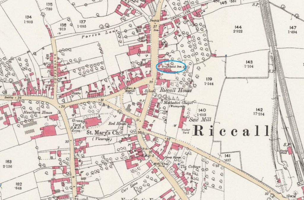 Guy Silversides (1784-1861), the publican at the Greyhound Inn in Riccall, was convicted on 2 March 1824 at the East Riding of Yorkshire Quarter Sessions. His offence, ‘against the conditions of recognizance for the license of an ale house’, resulted in a fine of one guinea with costs of 10 shillings and two pence. The following map shows the location of the Greyhound Inn in Riccall (Ordnance Survey Yorkshire CCVI.II date 1891).