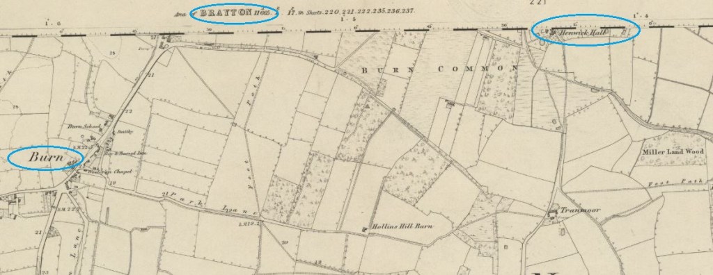 John, my first cousin four times removed, was baptised on 5 July 1817 in Brayton, Yorkshire. His parents were Thomas Palframan (1786-1858) a farmer, and Mary Ann Brabs (1792-1852). John married Sarah Otley, by licence, on 22 September 1846 in Brayton parish church. He was a bachelor and farmer from Henwick Hall in nearby Burn and Sarah (1818-1872) a spinster from Brayton. Together they had nine children, six daughters and three sons, although one son died in infancy. (The following map is OS Yorkshire sheet 236 published in 1853 and shows the location of Henwick Hall.)