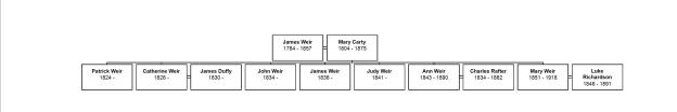 My great grandmother, Violet, was in her nineties when she died. We used to visit her regularly and I don’t remember her ever talking about her family. What a missed opportunity to find out more about the lives of her grandparents, James and Mary Weir/Wear, and their family in Ireland. It would have been really interesting to know more about her three aunts and three uncles. The aunts have been easier to trace than the uncles which was something of a surprise. They were in order of age as follows: