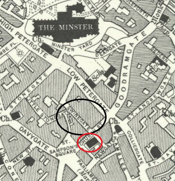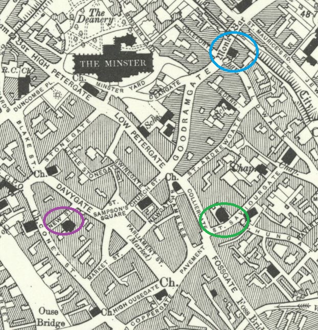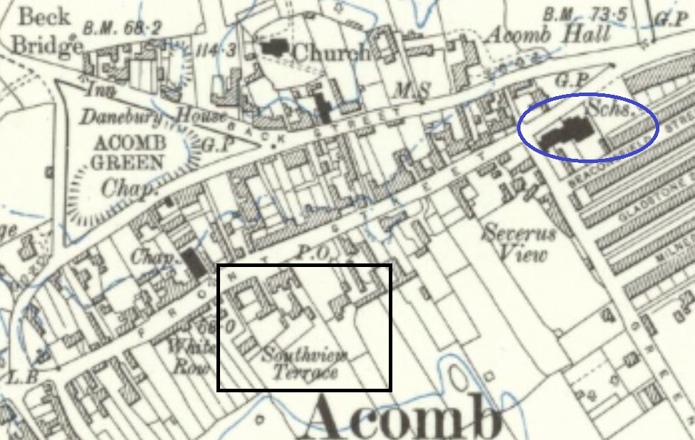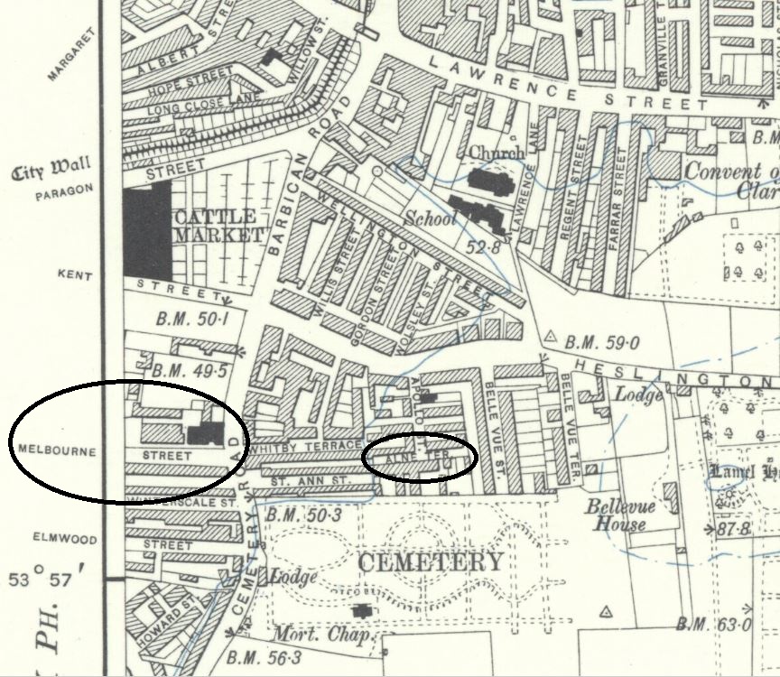 Returning to their son Henry’s education records, he finally left Acomb School at the age of eight on 4 October 1901. In the 1901 census Henry was with his father George, living with George’s brother William, at 62 Vicarage Rd, Tottenham. Annie (as Madge Morley) was at 1 Tidy St, Brighton, where she was described as a married actress. Their daughter Madge was at 4 Whitehall Cottages, Acomb with Frederic and Sarah Brown and described as their niece. She was their great niece, as Annie’s mother was Maria, Sarah’s sister. The following map shows the location of the cottages in Acomb.