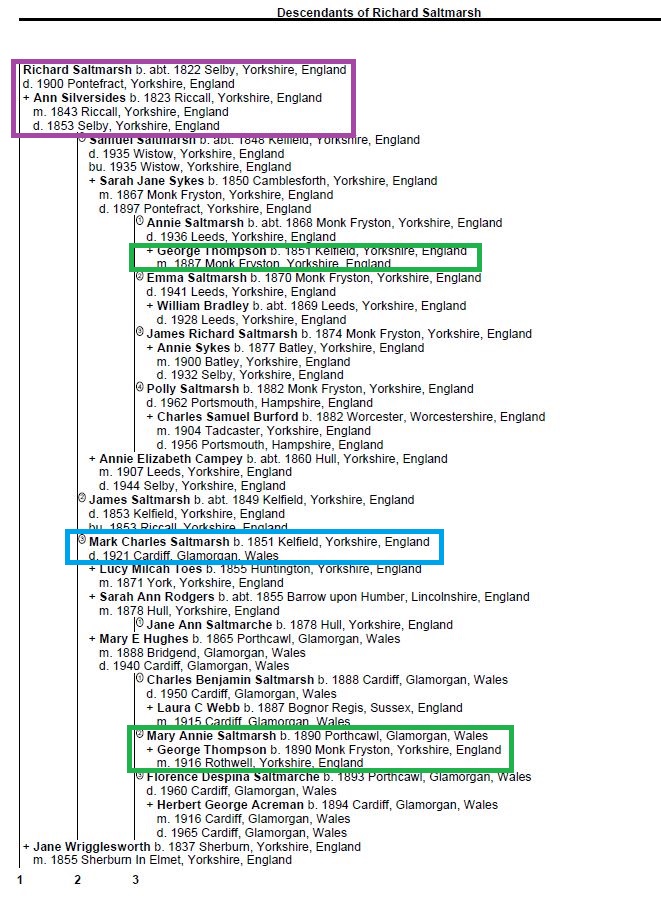Two cousins marry – Mary Saltmarsh and George Thompson – Mary (born 1890) in Porthcawl, Wales was the eldest daughter of Mark and Mary. She wasn’t living with her mother and two siblings in 1911 and was a boarder with the Jackson family in Batley, West Riding of Yorkshire. How she had secured work as a cotton weaver is not clear, however at some point she had met her 1st cousin once removed, George Thompson (born 1890). They married on 5 February 1916 in the parish church of Middleton, Yorkshire. George gave his occupation as a miner from Belle Isle, and that his father George was deceased and been a railway guard. Mary’s address at the time of their marriage was recorded as 36 Janet Street, Cardiff where her mother had been living in the 1911 census. Her father was given as Mark Charles Saltmarsh, a seafaring engineer. Unfortunately, further records for the couple have been difficult to trace.