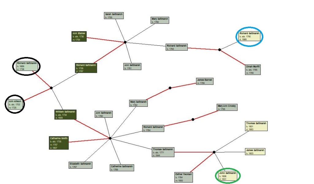 The following dandelion chart for Richard shows him, his wife Ann Allison (born 1702) and two generations of descendants. The blue circle highlights Richard (1790-1868) whose son Richard married my fourth great aunt Ann Silversides and the green circle denotes John Saltmarsh (1806-1831) who married Ann, my second cousin five times removed.