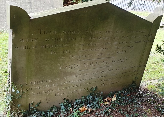 A contact from a fellow family researcher alerted me to an interesting grave in St Helen’s churchyard, Stillingfleet, which lists the names of 11 people who were drowned in the tidal River Ouse on 26 December 1833. He kindly agreed that I could use the following photos of the grave:
