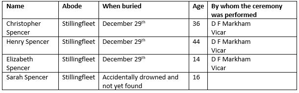 An inquest into the tragedy was held on 27 December 1833 at the White Swan Inn, Stillingfleet where the landlord was Mr Sturdy, Clarissa’s father. The coroner was John Wood Esquire and a jury was elected from the local community. It was extensively reported in the York Herald (4 January 1834, page 3); the viewing of the nine deceased individuals was described as follows: